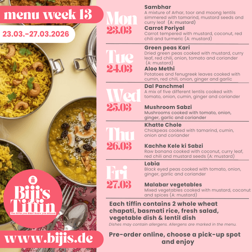 basmati rice, 2 chapatis, salad, one dal dish of the day and one vegetable dish of the day.